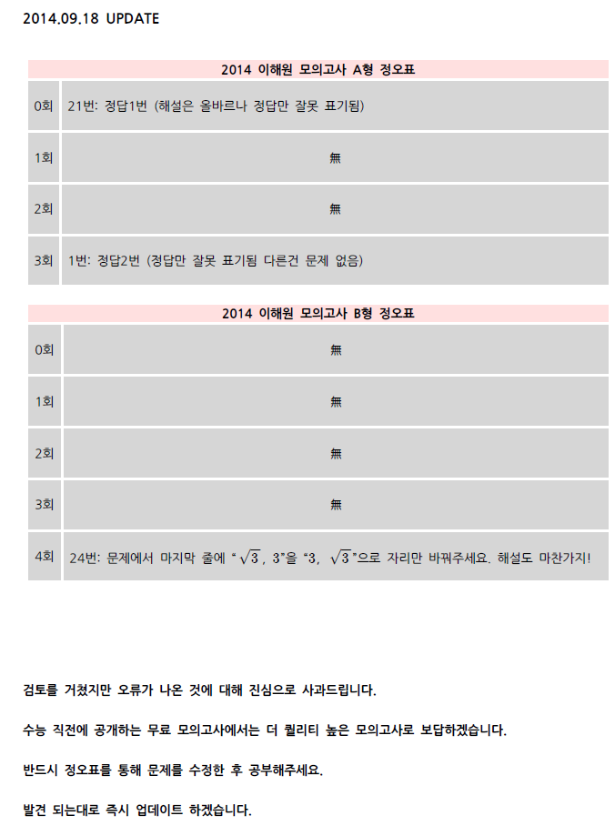 오늘 A형 구매했습니다. 혹시 '이해원 모의고사 A형'과 관련된 정오표나 자료(부교재 목록에 있는 것 보다 최신버전이 존재 할 경우)있으시면 minjae263@naver.com 으로 보내주세요. 부탁드립니다.